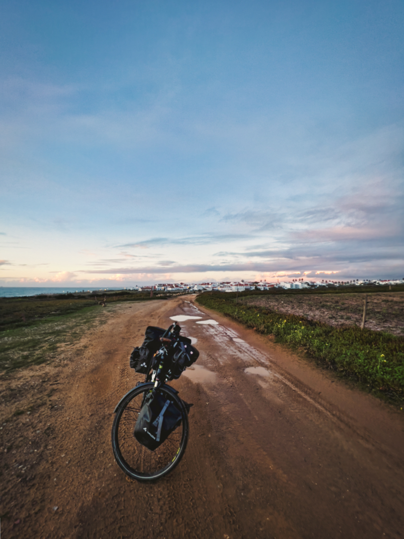 Der Morgen begann früh. 66 Kilometer lagen noch vor mir, bis ich Lissabon endlich erreichen würde. Das Wetter war launisch – mal Sonnenschein, mal drohende Regenwolken. Doch bevor es losging, musste ich erst einmal mein Fahrrad schieben. Der Sandweg war tückisch, das Rad rutschte ständig weg. Sobald ich wieder auf festem Untergrund war, konnte es richtig losgehen.