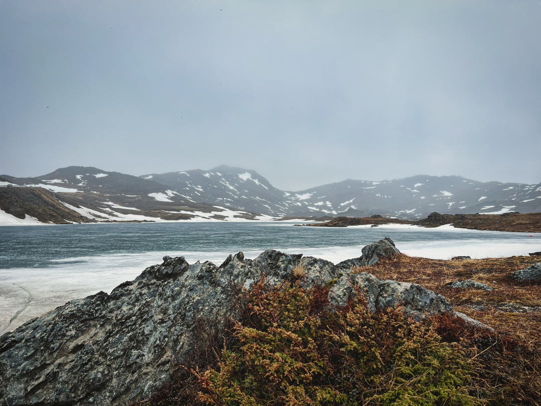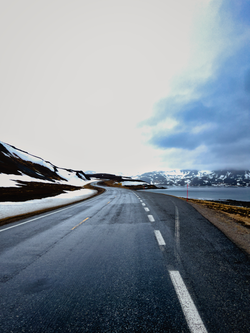 Der Aufstieg zum Nordkap war alles andere als einfach. Ein 9-prozentiger Anstieg über drei Kilometer verlangte mir alles ab. Aber je höher ich kam, desto mehr wurde mir bewusst, wie viel schöner und majestätischer die Natur hier oben war. Der zugefrorene See hinter mir und die verschneiten Landschaften rundum waren atemberaubend. Trotz des Regens und des kalten Windes konnte ich nicht anders, als die Schönheit der Umgebung zu bewundern. Ich kämpfte mich also weiter den Berg hinauf.