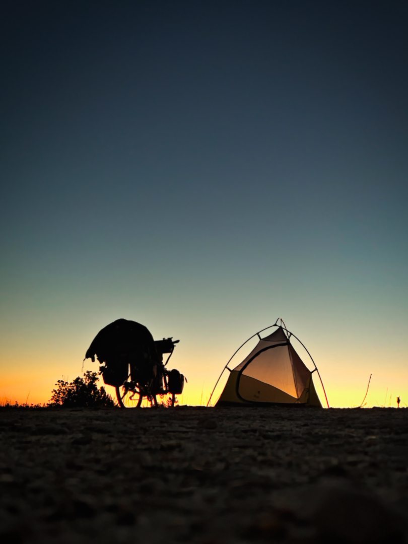 Nach einiger Zeit fand ich eine vielversprechende Stelle: eine Wiese neben einem verfallenen Gebäude. Perfekt - oder? Ein Blick nach rechts ließ mich kurz zögern: direkt daneben ein Friedhof. Doch was soll’s? Ich stellte mein Zelt auf, und genau in dem Moment, als ich fertig war, begann es zu regnen.