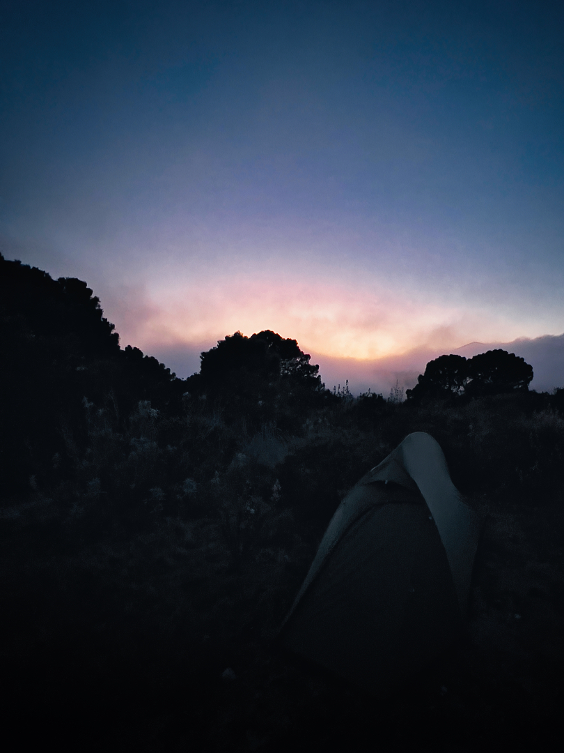 Nach einem langen Aufstieg fand ich einen perfekten Platz für die Nacht. Die Sonne tauchte alles in ein mystisches lila Licht - ein magischer Moment. Am nächsten Morgen, umgeben von Nebelschwaden, packte ich mein Zelt zusammen und machte mich bereit für eine rasante Abfahrt. Doch meine Wasserflaschen hatten über Nacht Algen angesetzt. Eine Lektion: Regelmäßig reinigen!