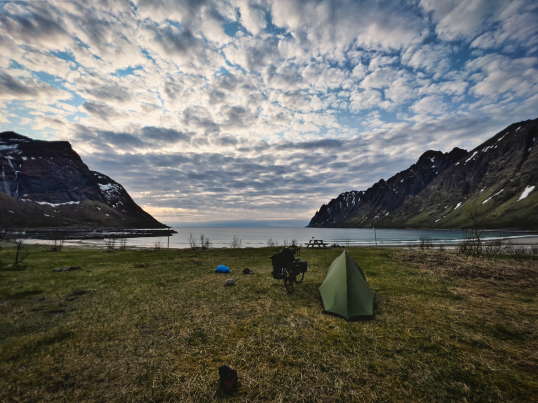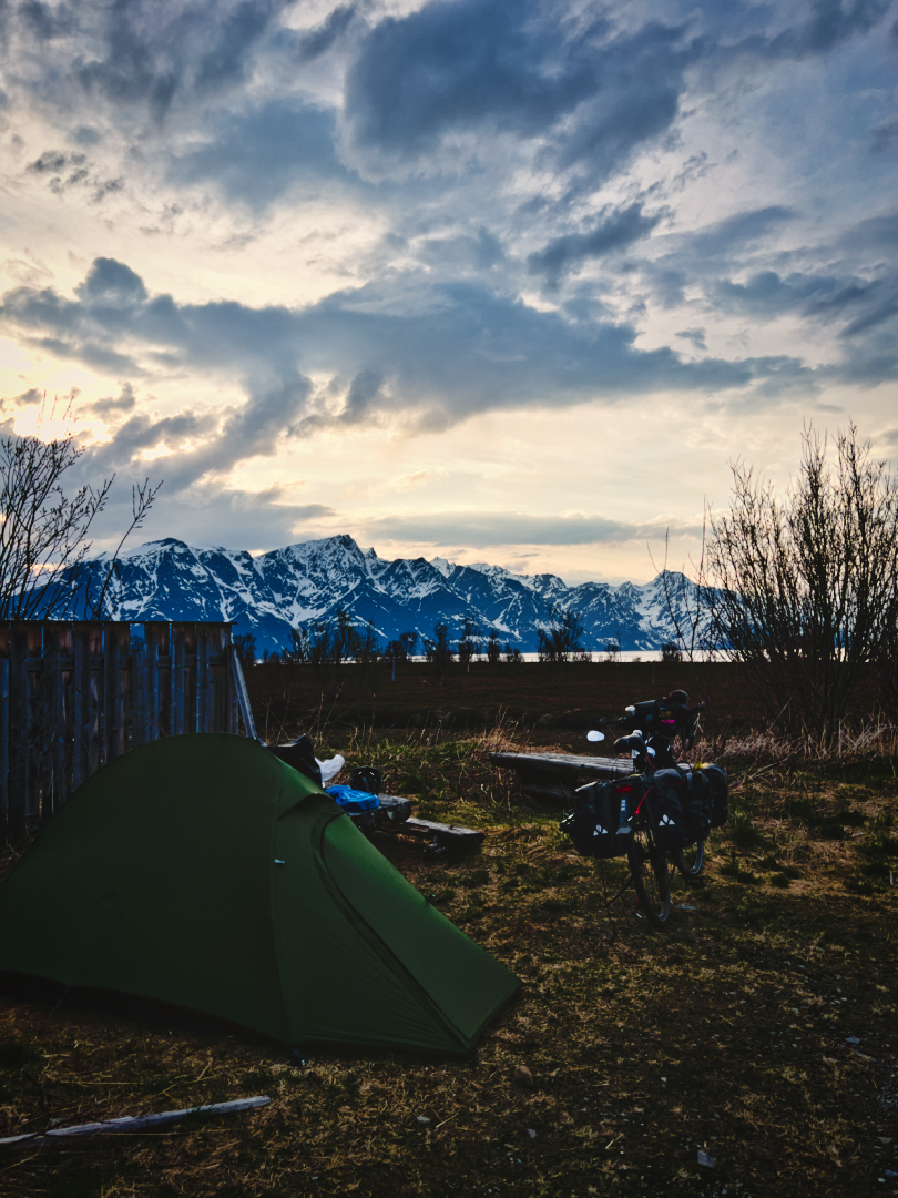 In Tromsø selbst schien ein besonderer Feiertag zu sein. Überall liefen Menschen in Trachten und Anzügen herum, norwegische Fahnen flatterten im Wind. Die Geschäfte waren geschlossen, und ich fuhr durch die Stadt, während mich der Regen langsam durchnässte. Danach ging es weiter Richtung Unterkunft. Nach fast zwei Wochen auf dem Rad wurde es Zeit für eine Pause. Ich spürte die Anstrengung in jeder Faser meines Körpers, aber die Vorfreude auf ein paar ruhige Tage trieb mich weiter.