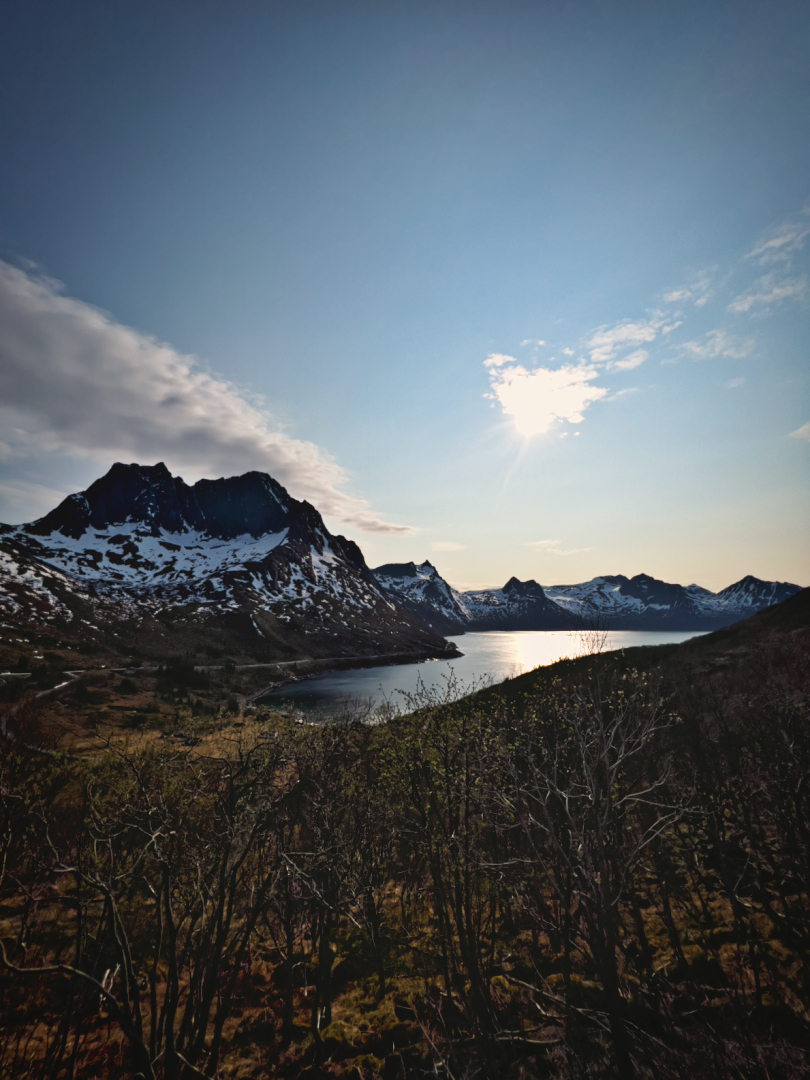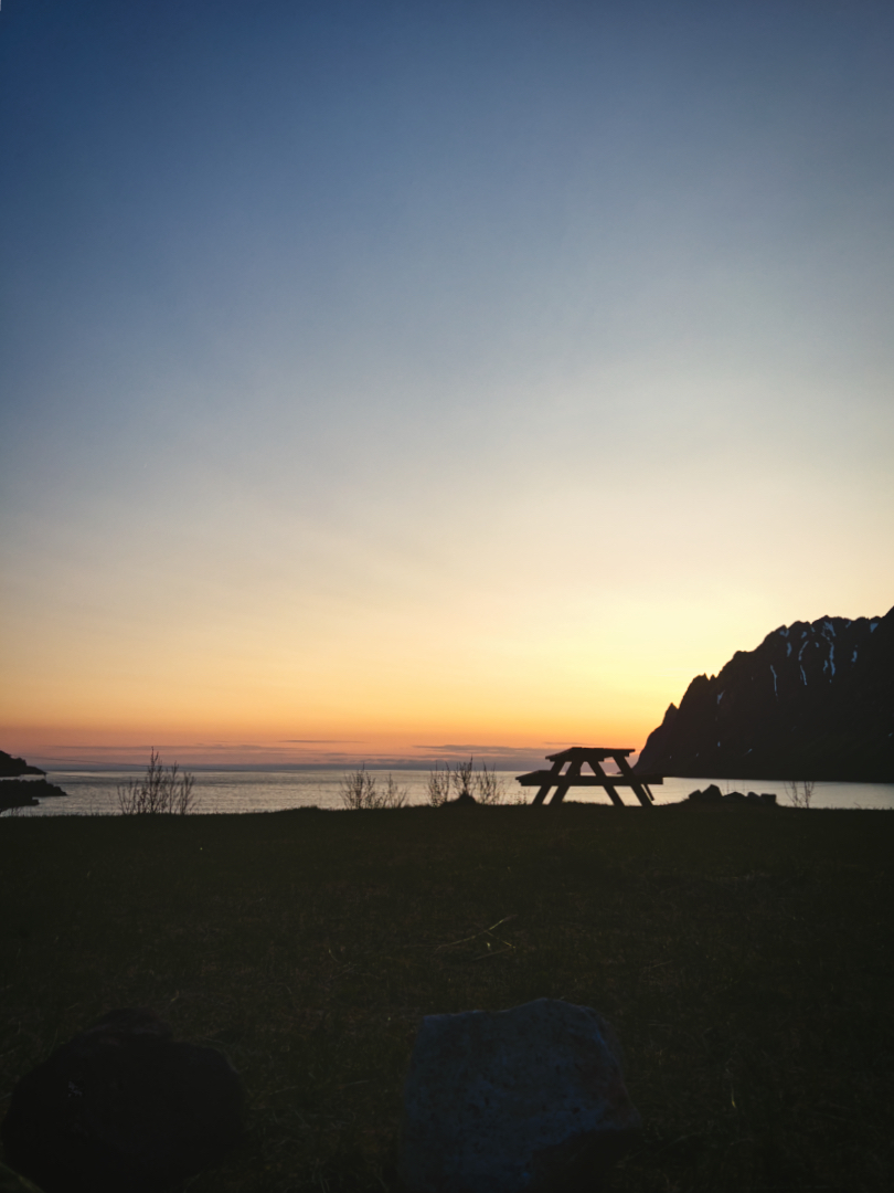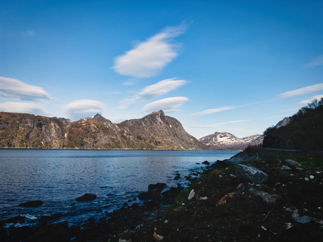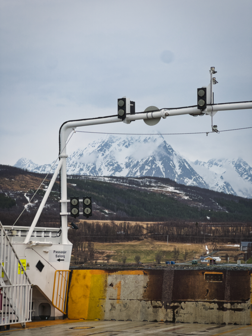 Nach vier Tagen Pause war ich wieder unterwegs. Die stürmischen Tage hatte ich in der Unterkunft ausgesessen, doch nun wartete das nächste Abenteuer: die Überfahrt nach Senja. Bis zur Fähre waren es entspannte 25 Kilometer, also ließ ich mir Zeit, genoss die Natur und gönnte mir unterwegs noch einen Kaffee. Angekommen an der Fähre hieß es warten – noch eine Stunde bis zur Abfahrt. Die Sonne schien, aber für morgen war schon wieder Regen angesagt. Ich hoffte, dass das Wetter mir diesmal ein wenig mehr Glück brachte.