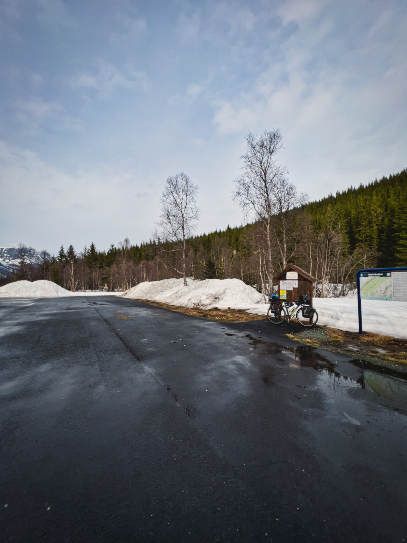 Die Nacht war weniger optimal. Direkt neben einem Parkplatz schlug ich mein Lager auf – überall lag noch Schnee, also blieb mir kaum eine andere Wahl. Immerhin wurde ich gewarnt: Weiter vorne gäbe es gar keine Übernachtungsmöglichkeiten mehr. Also machte ich das Beste daraus. Die Straße war nah, ab und zu rasten Autos vorbei, aber nach all den Tagen unterwegs störte mich das kaum noch. Ich legte mich hin und hoffte auf eine halbwegs ruhige Nacht.