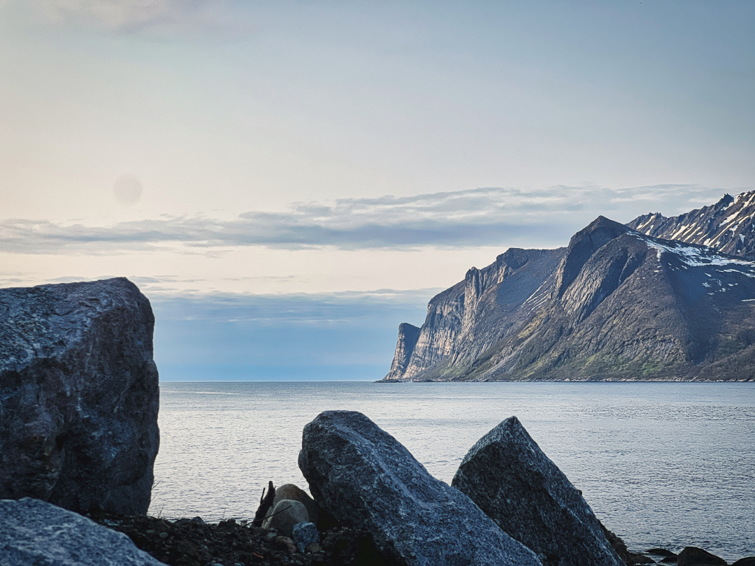 Der nächste Tag begann mit Regen. Der Himmel, gestern noch strahlend blau, hatte sich wieder in eine graue Decke gehüllt. Noch 50 Kilometer bis zur Unterkunft, einmal durch Tromsø durch. Mein Host hatte mir einen Tipp gegeben: Aufs Meer achten, denn es gab wohl gerade viele kleine Wale in der Gegend. Also hielt ich die Augen offen.