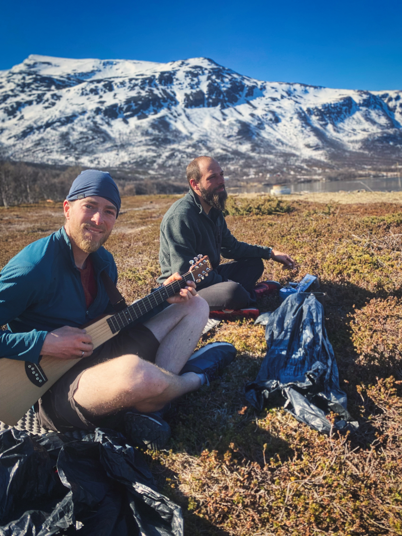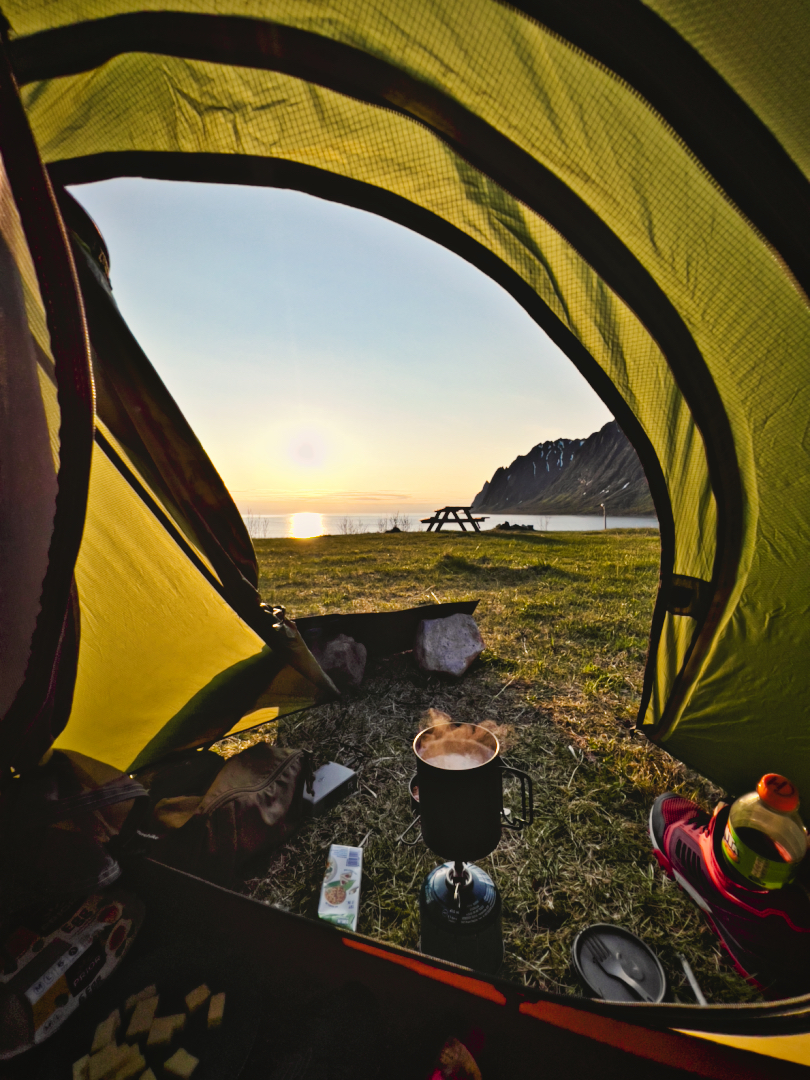 Endlich Sonne! Nach Tagen voller grauem Himmel und Regen schien heute Morgen endlich die Sonne. Ein seltener Anblick hier in Norwegen, und es tat unglaublich gut. Simon und Deby waren schon dabei, ihre Sachen zusammenzupacken – sie waren mal wieder schneller als ich. Der Pass gestern war anstrengend, aber heute sollte es weitergehen. Noch ein Kaffee, ein paar letzte Worte mit den anderen, dann brach ich auf.