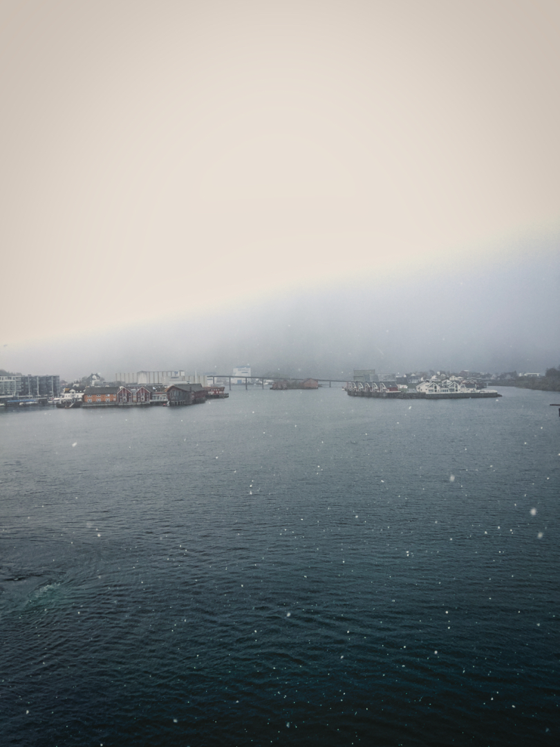 Die Überfahrt bot zumindest eine neue Perspektive: Ich konnte die Lofoten von Deck aus bestaunen, während das Wetter wechselte zwischen kurzen Sonnenstrahlen und plötzlichen Schneeschauern. Nach einer langen Nacht auf der Fähre kam ich schließlich in Bodø an. Ich nutzte die Zeit, um meine Ausrüstung zu trocknen – alles war klamm und nass. In einem kleinen Hotel konnte ich endlich wieder eine warme Dusche genießen, ein Luxus, den ich nach Tagen im Regen und Wind umso mehr zu schätzen wusste.