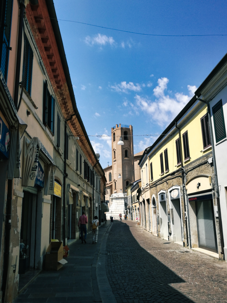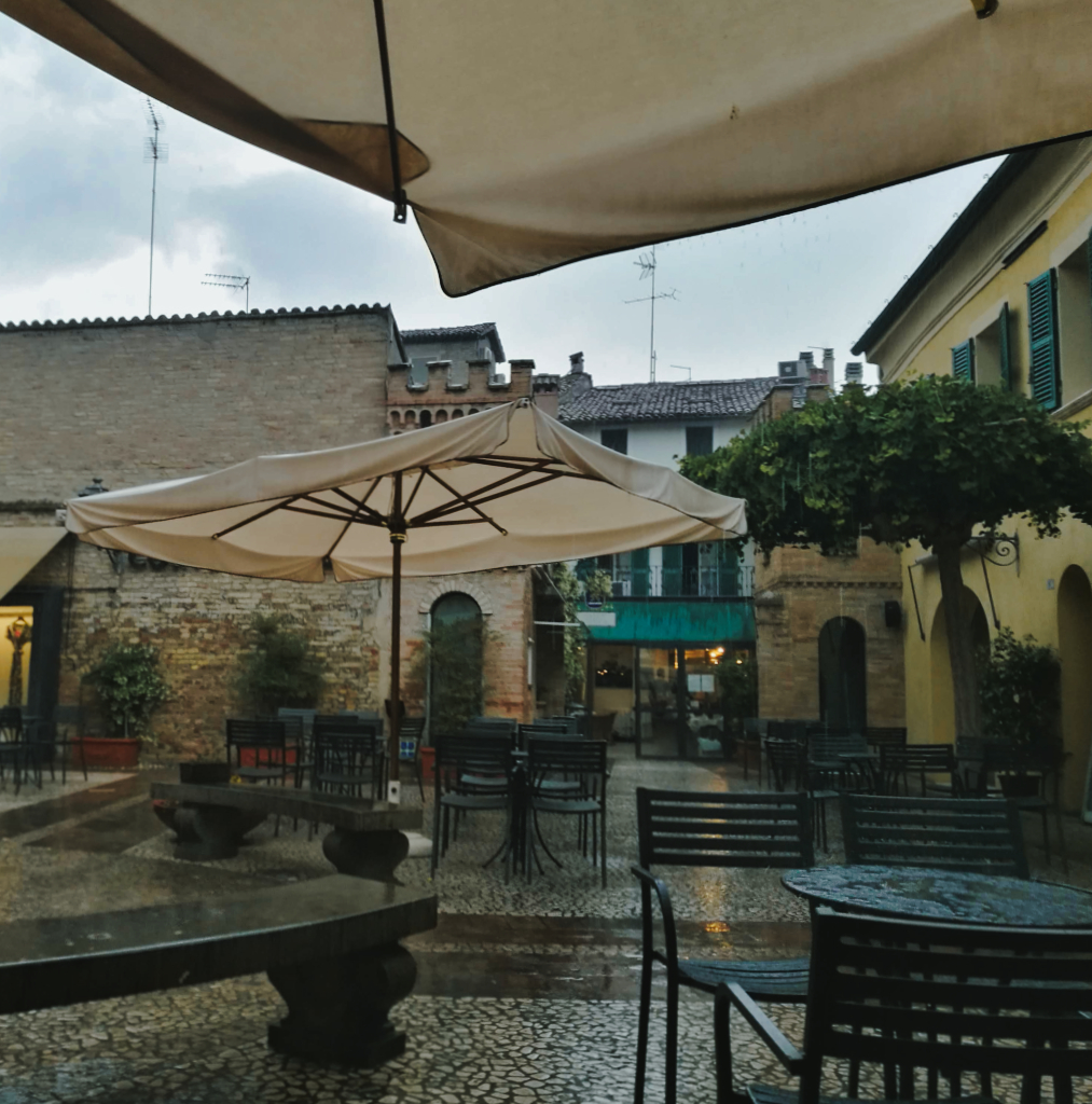 Zum wiederholten Mal gestaltete sich meine Nacht, bedingt durch die Isomatte, welche weiterhin ein Loch hatte, besonders hart. Aufgrund des schlechten Schlafes und der extrem schwülen Luft, die schon am frühen Morgen herrschte, da es nachts regnete, ließ ich mich dazu überreden nur 20 km bis nach Ravenna zu fahren und von dort den Zug bis Florenz zu nehmen. Auf dem Weg nach Ravenna begann es wie aus Eimern zu regnen. Wir schmissen unsere Regenkleidung über und fuhren weiter bis wir uns in Ravenna, schützend vor dem Regen, unter einen Sonnenschirm eines Restaurants unterstellten. Wir bestellten Snacks und Cocktails, bevor es weiter zum Bahnhof und nach Florenz ging. So sparten wir uns 150 km bergauf auf einer stark befahrenen Straße bei Regen. Da ich jedoch mit dieser Entscheidung nicht ganz zufrieden war, entschied ich mich schon bei der Zugfahrt, ab Florenz wieder allein weiterzufahren.