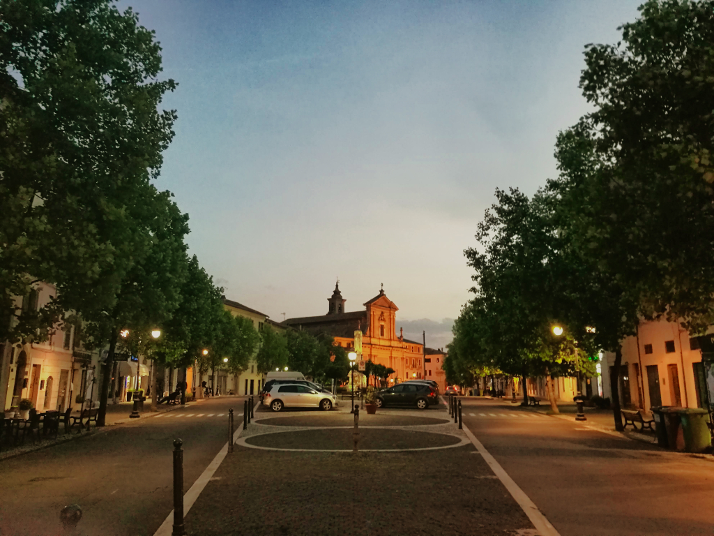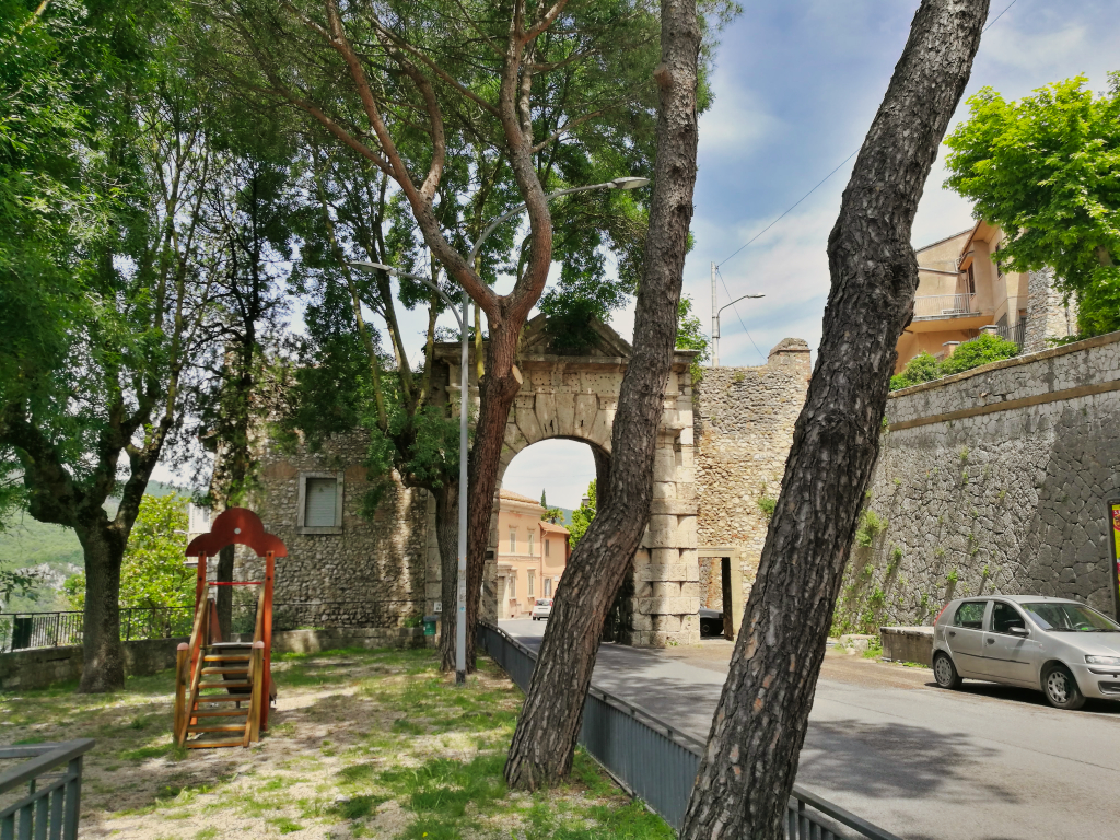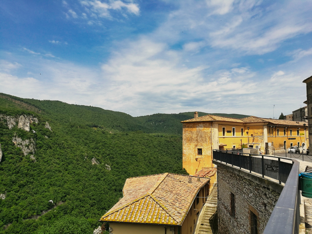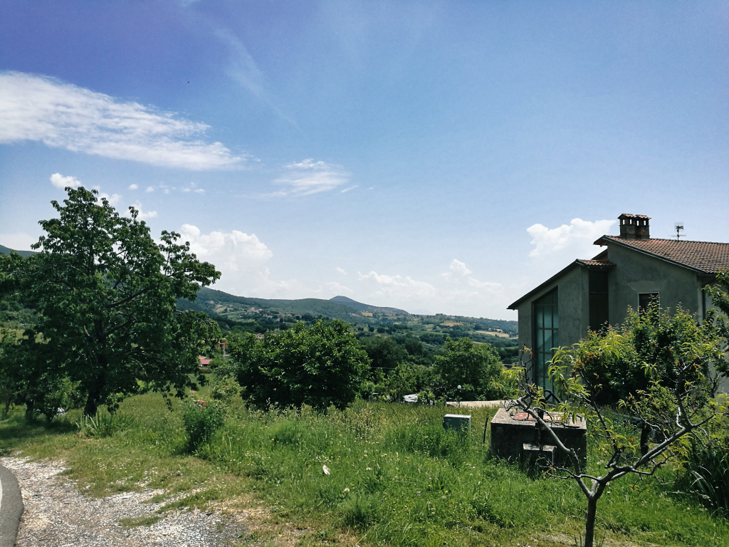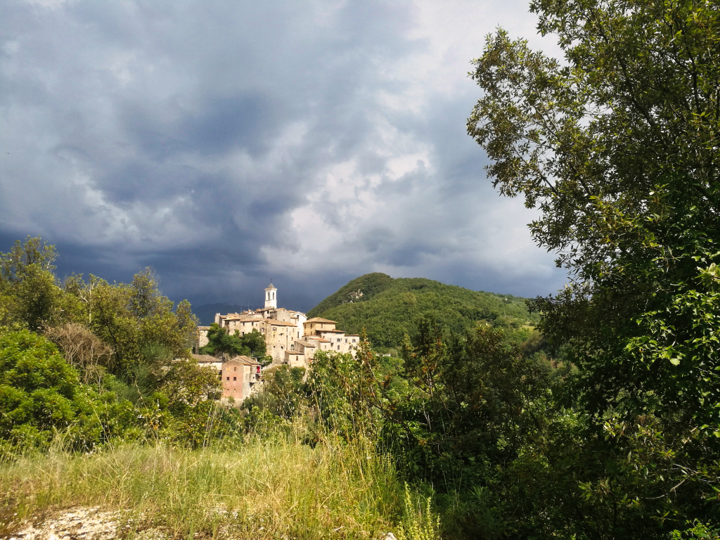 So fuhr ich Hügel für Hügel durch die Gegend, bis ich einen kleinen Laden fand, bei dem ich Reserven auffüllen konnte. Hier buchte ich mir gleich ein Zimmer in Montebuono. Der Vermieter schrieb mir jedoch nach der Buchung, dass er das Zimmer aufgrund eines Rohrbruches wieder stornieren müsse. So fuhr ich erst einmal weiter, ohne zu wissen, wo ich die Nacht verbringen würde, als plötzlich, wie aus heiterem Himmel, sich ein Unwetter über mir zusammen braute. Ich entschied mich kurzerhand einen anderen Weg zu fahren, um schneller aus dem bergigen Gebiet zu kommen. Als es dann wie aus Eimern anfing zu regnen und ein gewaltiger Blitz in der Gegend einschlug, wo mich meine eigentliche Route hinführte, entschied ich mich unter einen winzigen Torbogen eines Vorgartens zu stellen. Ich presste mich so gut es ging gegen die kleine Holztür und versuchte so wenig wie möglich im Wasser zu stehen.